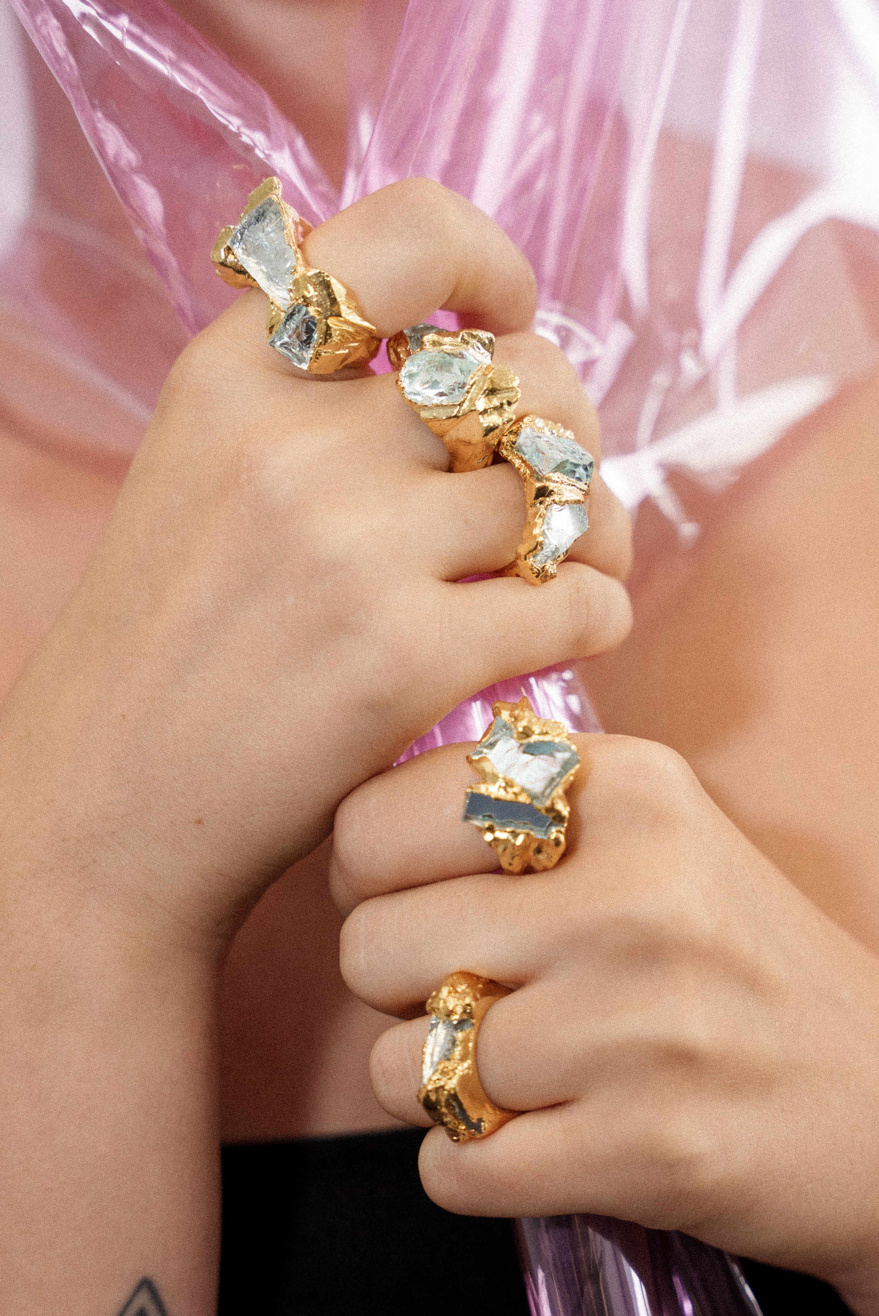 À la fois brut et délicat, ce bijou est réalisé entièrement à la main. L'ensemble est plaqué or 24K, réhaussé d'un miroir taillé selon les techniques de taille emblématiques de la marque.