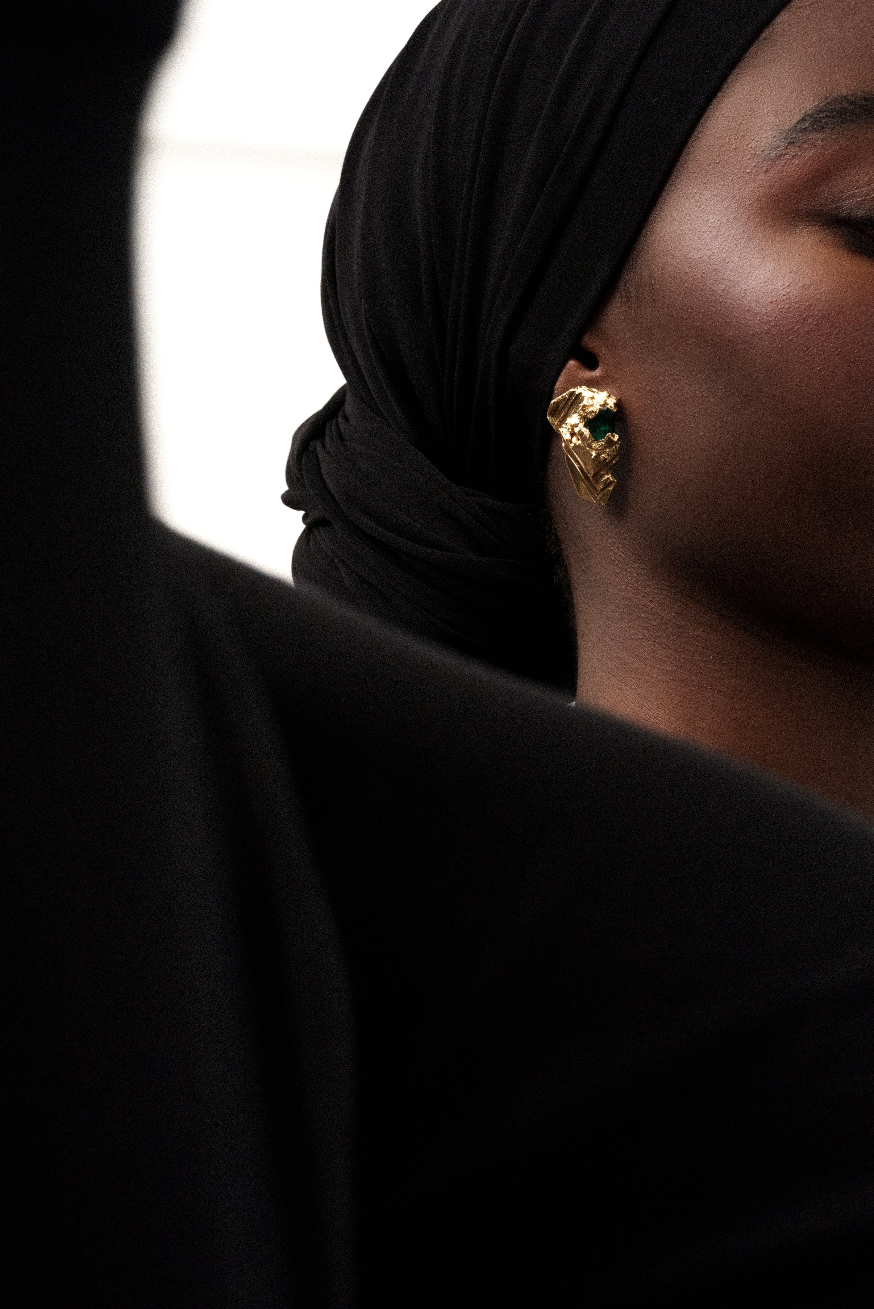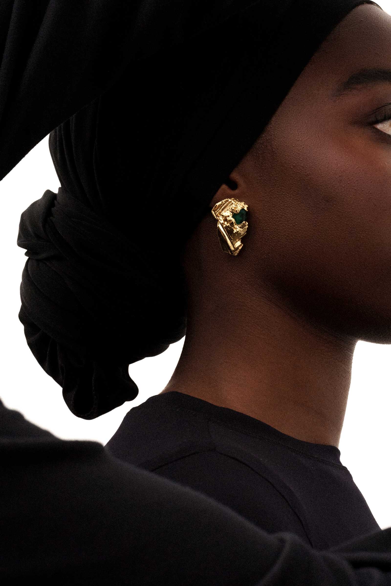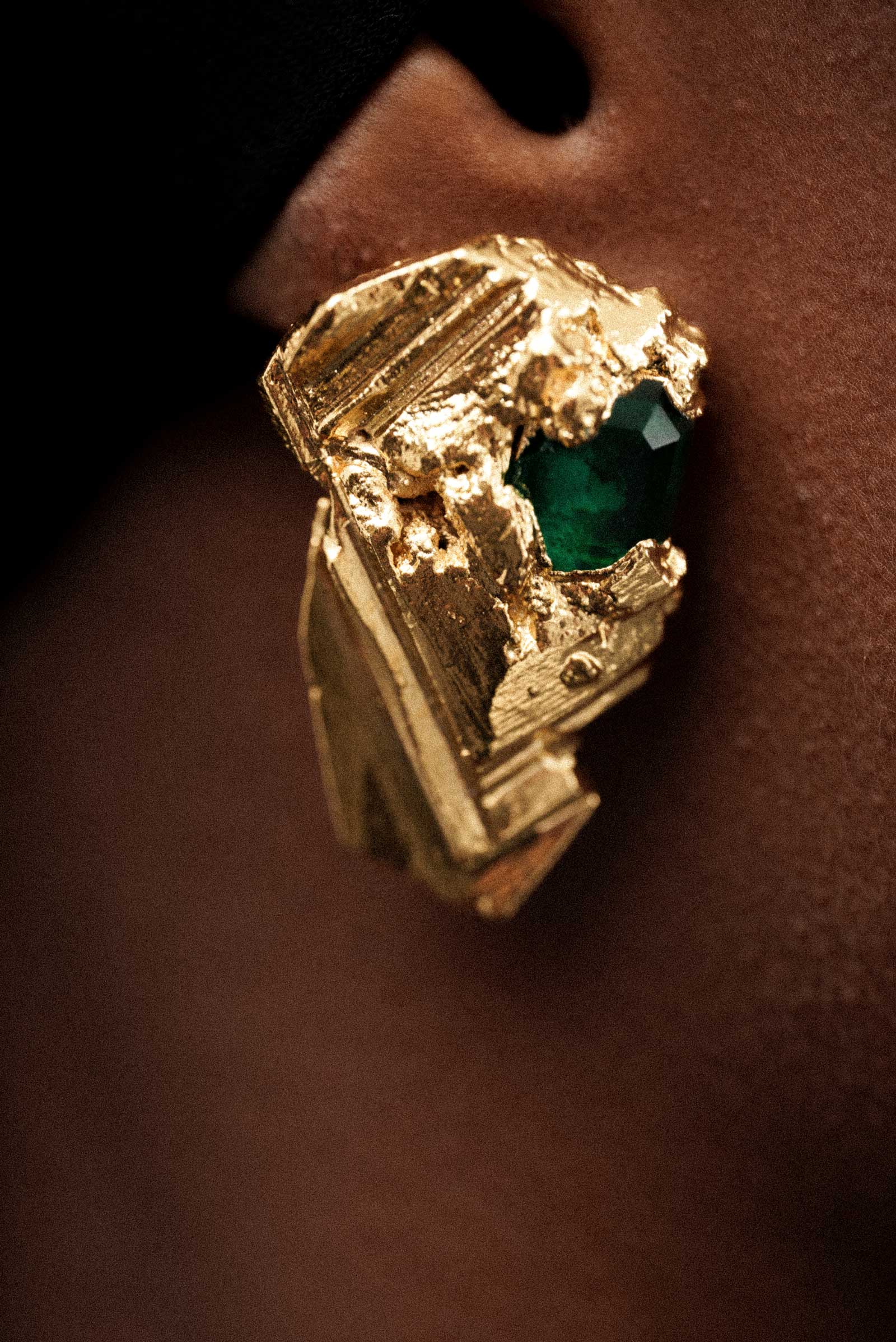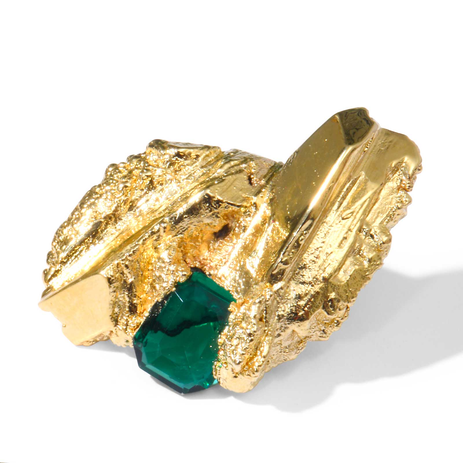 Ces boucles d’oreilles sont des pièces uniques sculptées en résine incrustées de pierres en cristal facetté. L’ensemble est électroformé, doré à l’or fin 24K.